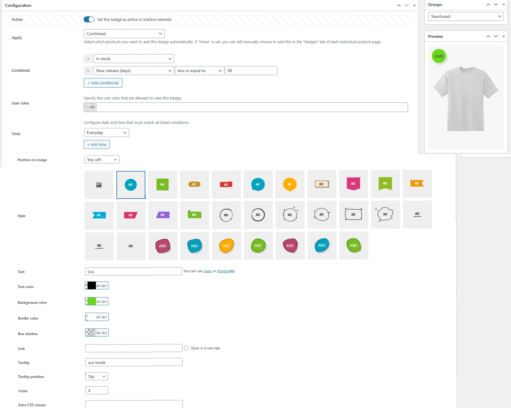 My idea was to show on all products I have created in 90 days after creation the badge "Uus" (New) if they are in stock.