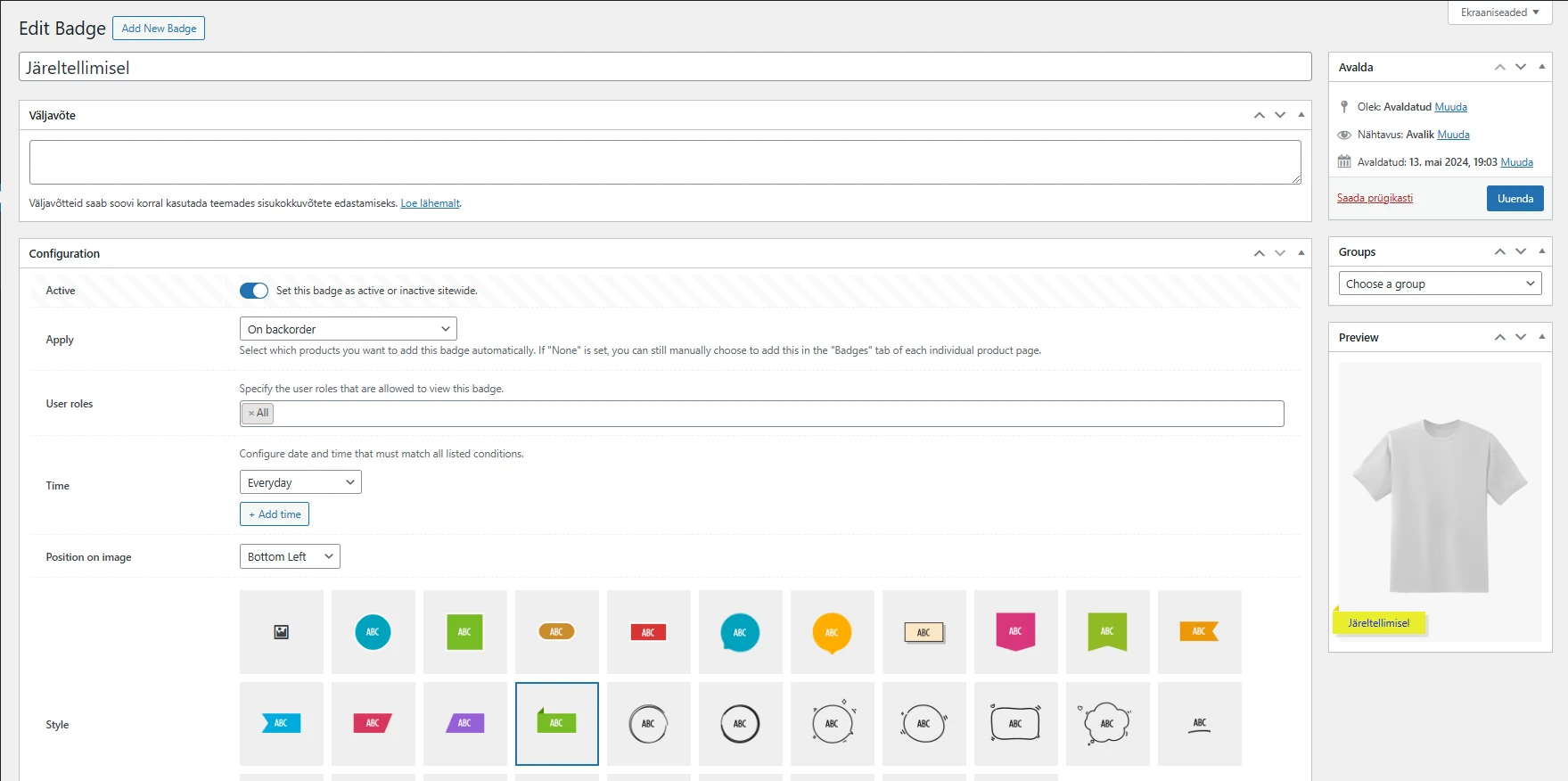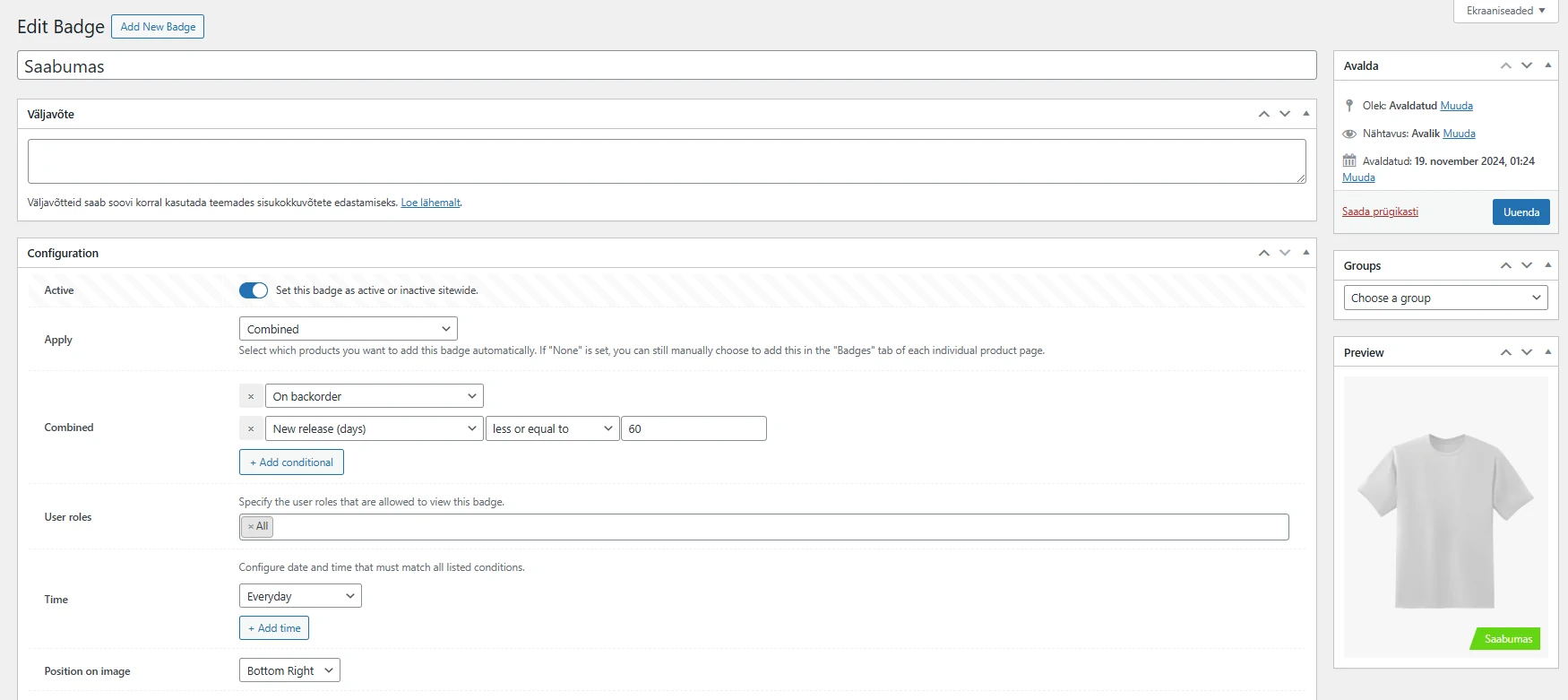 Hi support, I have a shop on address www.balticboatnet.eu (you might not see as I have restrictions for access by countries) and I just bought your premium version, because there was promised an option to have combined badge. I made badge for New product called in Estonian "Uus" (new). I put into first position an option "In stock" and into second option "New release (days) with less or equal to 90 days". My idea was to show on all products I have created in 90 days after creation the badge "Uus" (New) if they are in stock. Unfortunately the badge is displayed not only on products in stock, but also on products in backorder (see attached file named "Screen...). I made also test and I loaded instead of In stock the option On backorder, then only backordered products got the badge "Uus" (New). When I turned back into in stock the set up, then again both goods in stock and goods in back order got the badge. Looks your term in stock understanding the status of the product wrongly. I have also badge "Järeltellimisel" (On backorder), created by free version of your program and it works well. Appears only on goods not in stock allowed to be backordered. I made also new test badge based only on Backorder status of the product and everything works fine. Looks only then it does not work, when I have it as combined together with status new. When I changed stock status into out of stock it works well, no badge on products in stock and on backorder. I have also the combined badge "Saabumas" (arriving soon) for goods at back order and not created later as in 60 days. For this setup it works well. It appears only on goods on back order Please have a look into attached pictures about my problem. Looking a feedback and instructions, how to fix situation, because I do not want to have badge "Uus" (New) on products not in my stock (Statuses: 1. Out of stock 2. Backordered).