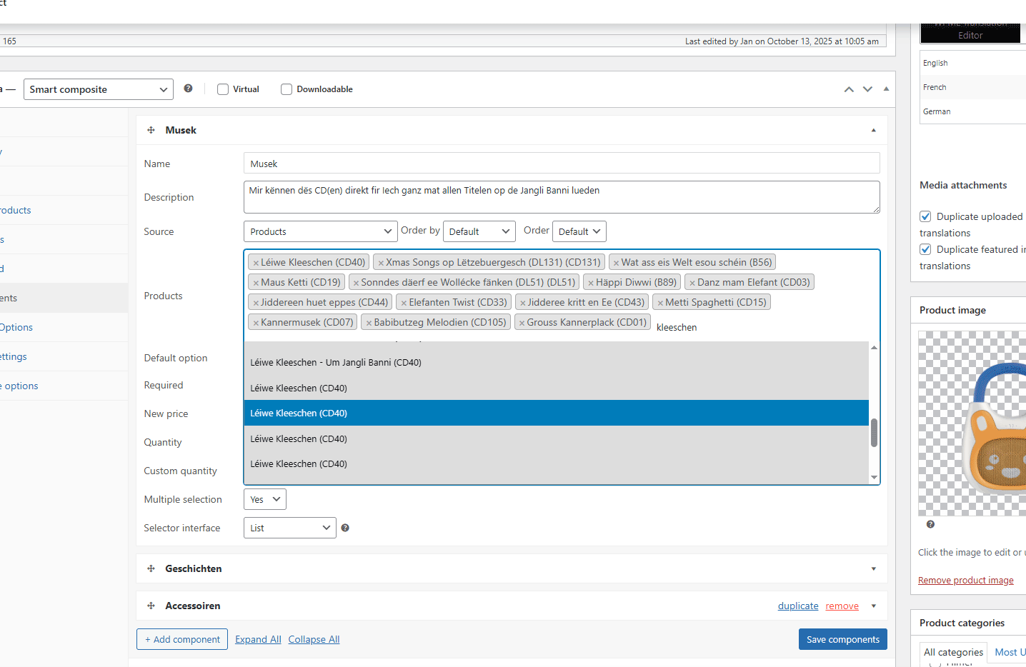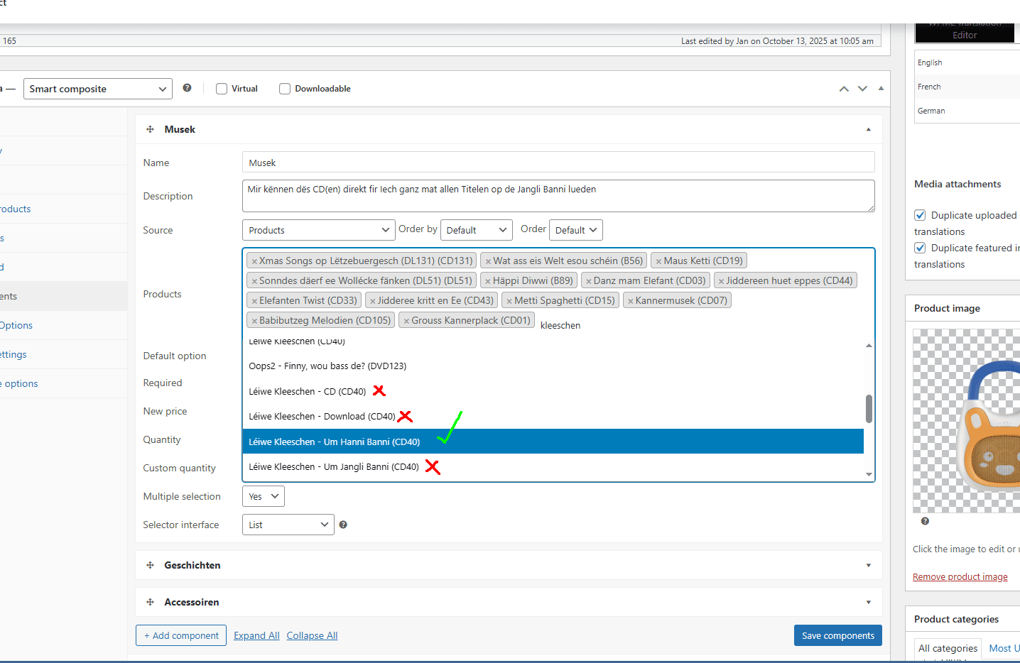 Comments 4Jan started the conversation2 weeks ago on October 13, 2025 at 8:29amhi WPCLEVER team,I would like to choose a specific variation as component, not the whole variable product.But when I select a variation, all variations are added as options.How can I only add a specific variation as component?thanks a lot,JanAttached files: Unbenannt-1.png Unbenannt-2.png Unbenannt-3.png 1,549Dustin replied1 week ago on October 15, 2025 at 9:12amHi Jan, Our plugin supports adding variations directly to the component: If it doesn't work correctly on your site, I need to access the backend to check. In that case, please purchase the premium license here https://wpclever.net/downloads/composite-products/ for premium support.Best regards,Dustin Sign in to reply ...