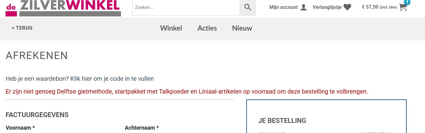 Er zijn niet genoeg Delftse gietmethode, startpakket met Talkpoeder en Liniaal-artikelen op voorraad om deze bestelling te volbrengen.