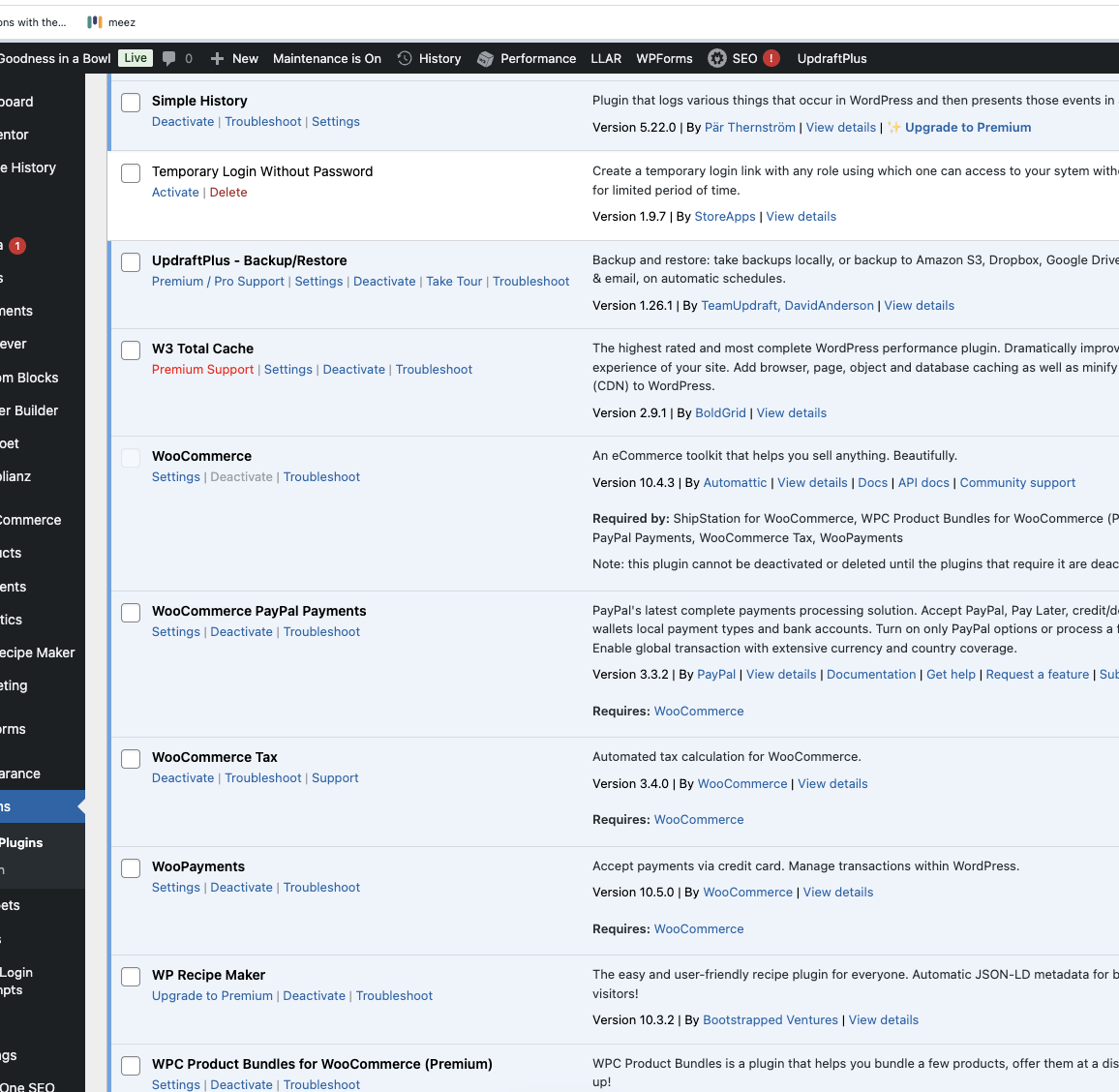 update for you. I was trying to disable plugins to see if one of them was causing this problem, and I noticed that WooCommerce is grayed out. The box to the left of it can't be clicked, so I can't disable it or remove it and reload it. Any suggestions? Thanks